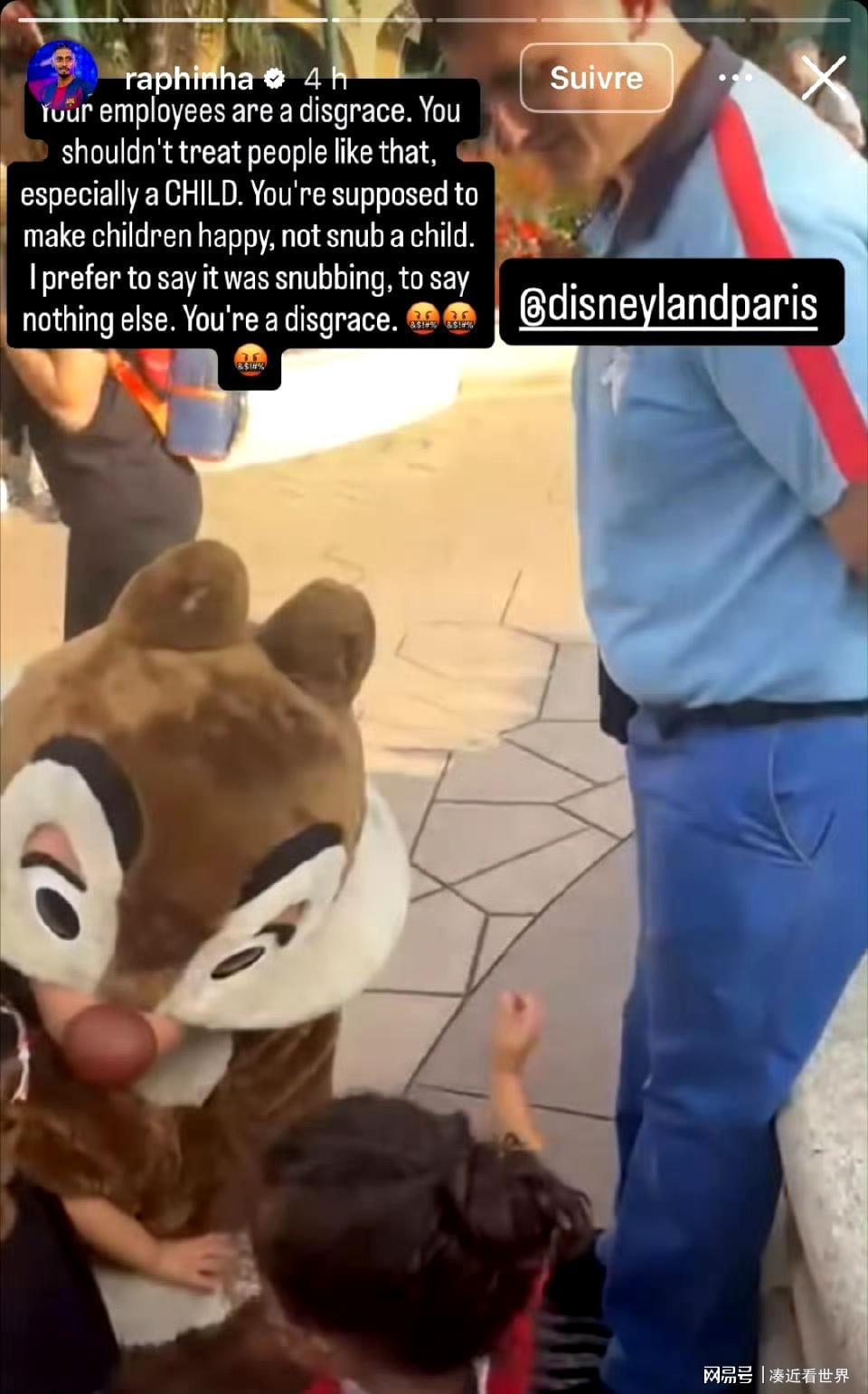 巴西前国足,现巴塞罗那前锋拉菲尼亚周五通过个人Instagram账号,公开指控法国巴黎迪士尼乐园一名员工存在不当行为,称对方在其年幼儿子试图打招呼时予以无视,且暗示该行为可能涉及区别对待。